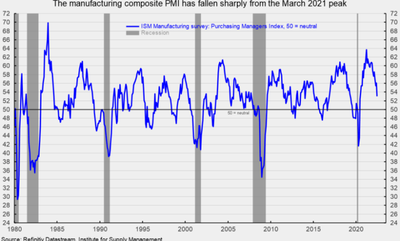 Overall, manufacturing survey respondents remained optimistic that healthy demand will continue. Noticeable softening among several individual survey indexes suggests supply and demand may be moving closer to balance, helping ease some upward price pressures. Furthermore, on the supply side, fallout from the Russian war against Ukraine continues to disrupt global supply chains. On the demand side, persistently elevated price increases are impacting consumer demand and an intensifying Fed policy tightening cycle is boosting financing costs. The outlook remains highly uncertain.