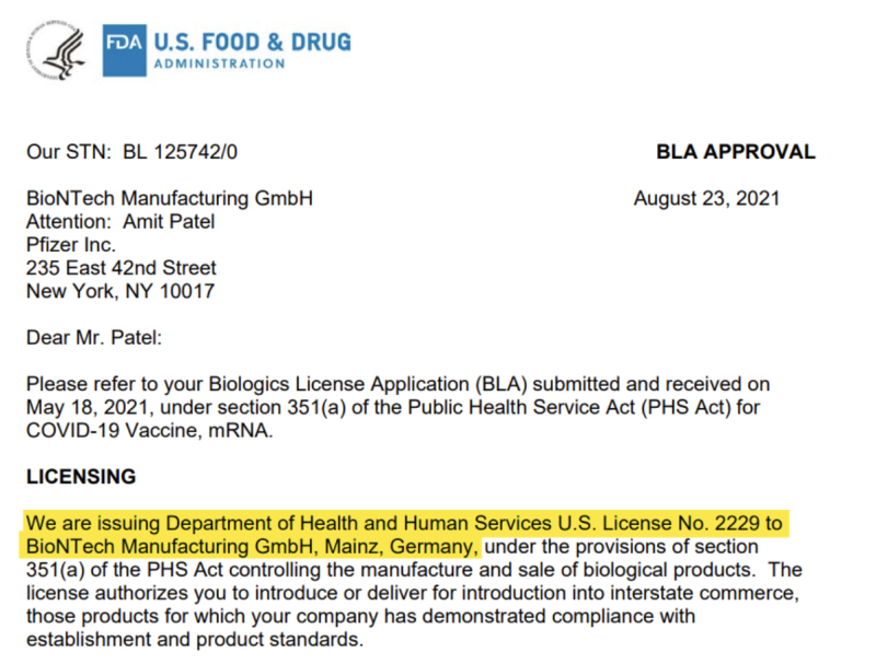 The August 23rd, 2021 letter granting the biologics license is available here. The top of the letter can be seen below. It should be noted that the biologics license was granted to the German firm BioNTech, not to Pfizer. The reason the letter was addressed to BioNTech c/o Pfizer is that Pfizer served as BioNTech’s US agent. As a foreign company, BioNTech was required by law to appoint a US agent. This is indicated in the May 6th, 2021 Biologics License Application, which is available here. The applicant is BioNTech. Contrary to what was stated in the Committee hearing, BioNTech was also the sponsor of the clinical trial.