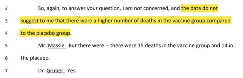 In a surreal exchange with subcommittee Chair Thomas Massie, Gruber even outright denied that there had been more deaths in the vaccine arm of the clinical trial than in the placebo arm. Though as a matter of fact, which she then went on to acknowledge, there were. “I am not concerned,” she said, “…the data do not suggest to me that there were a higher number of deaths in the vaccine group compared to the placebo group”. This was her response when presented with data showing 15 deaths in the vaccine group and 14 in the placebo group! See here, Appendix A, p. 119, and below.