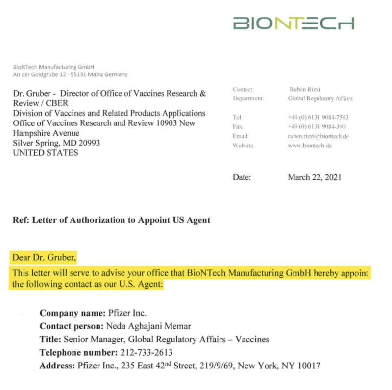 It was perhaps to avoid such questions that even Gruber persistently referred to the “Pfizer” Biologics License Application in her testimony to the House committee, even though she, of all people, knows perfectly well that the applicant was BioNTech. Not only is BioNTech clearly identified as the applicant in all the relevant regulatory documents, but the letter from BioNTech appointing Pfizer as the German company’s US agent was addressed to none other than Marion Gruber – as can be seen below.