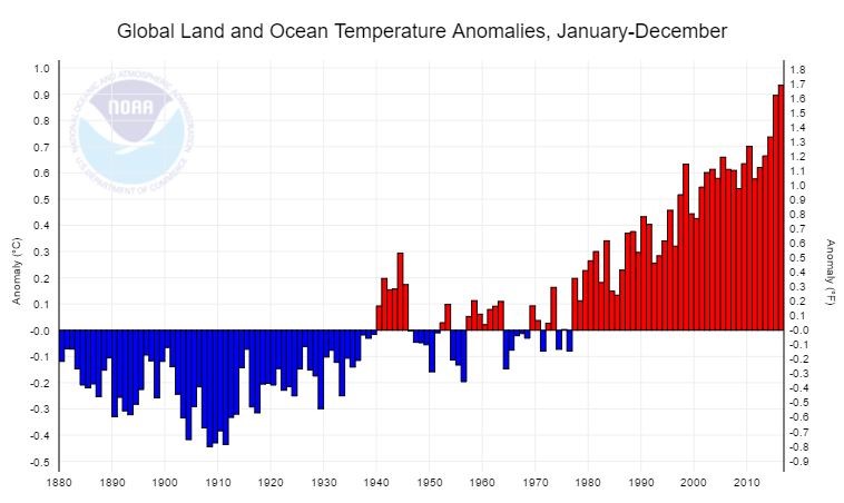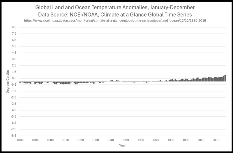 By now practically everyone who follows news and commentary about climate change has seen graphs of global warming over the past century or more. The National Oceanic and Atmospheric Administration (NOAA) produced this one in 2017, covering 1880–2016.