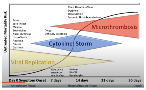 Because the original Wuhan variant and subsequent Delta variants of SARS-CoV-2 were more toxic, the failure to treat in early stages of the disease was an especially egregious lapse in medical ethics. The following chart released by cardiologist Dr. Peter McCullough in October 2020 shows the “Untreated Mortality Risk” in the stages of Covid-19 disease. The bar across the bottom shows the “Ambulatory Phase,” “Hospitalization Phase,” and “Death.” The black curved line shows the risk of mortality rising as the disease progresses without treatment.