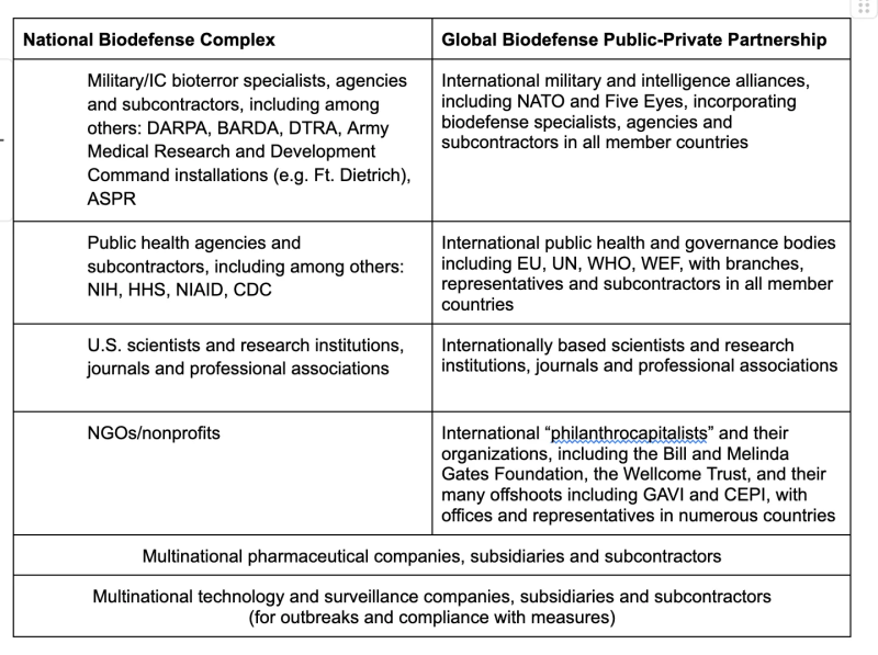 With these characteristics in mind, we can list some of the main components of the biodefense/pandemic preparedness public-private partnership, to see just how enormous a complex it is. We can also see how the national biodefense complex scales up and merges with the global entity: