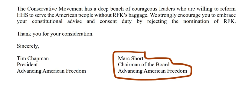 In a letter addressed to Republican Senators, AAF President Tim Chapman and Board Chairman Marc Short state several “concerns” they have regarding the “nomination of Robert F. Kenndy Jr. (RFK)” (sic) to head HHS, such as his views on vaccines, psychedelics, and abortion.
