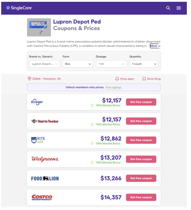 Puberty blockers are a particularly notable case for a safety discussion, as they are used off-label to block the natural progression biological of puberty in healthy kids and adolescents. Before being used for gender alteration, these drugs were typically prescribed for life-threatening endocrine disorders or cancers in the elderly or older adult populations. A price comparison for one kit (a one-month supply), leuprolide (Lupron) costs anywhere from over $12,000 to over 14,000 per month with an online coupon. Plus, under the Biden Administration, puberty blockers for transgender therapy would have been covered by the taxpayers: