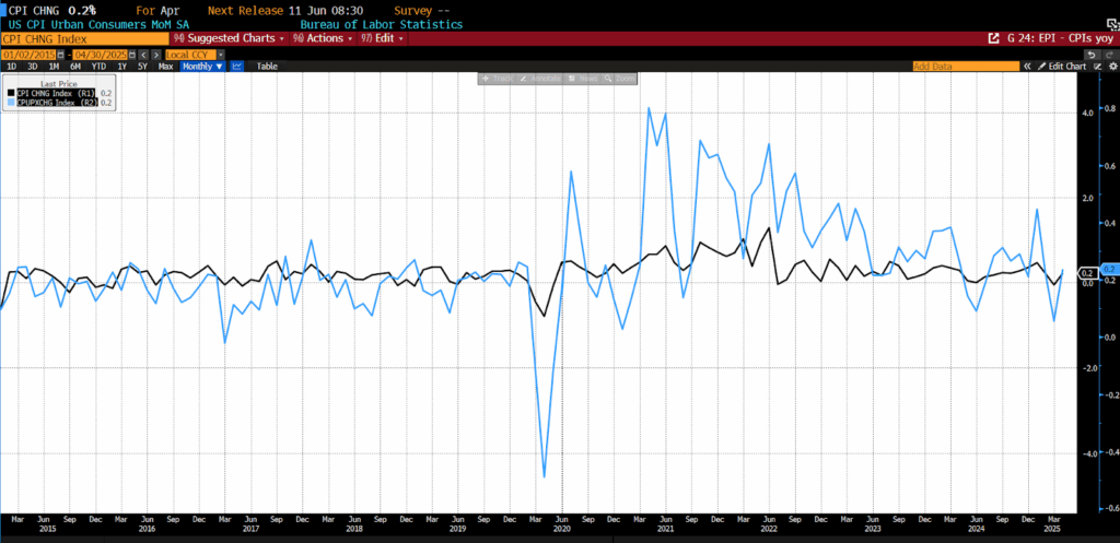 Also on May 13, 2025, the US Bureau of Labor Statistics (BLS) released its April 2025 Consumer Price Index (CPI) data. Both the month-to-month headline CPI and core month-to-month CPI number increased by 0.2 percent, less than the 0.3 percent increase forecast for both.