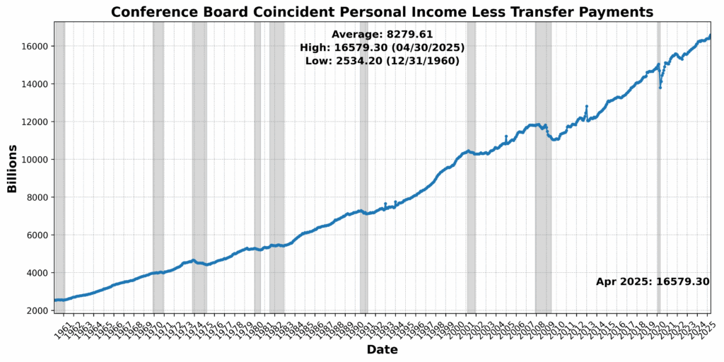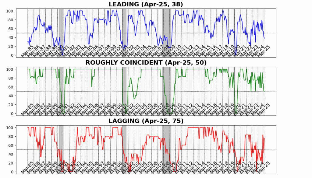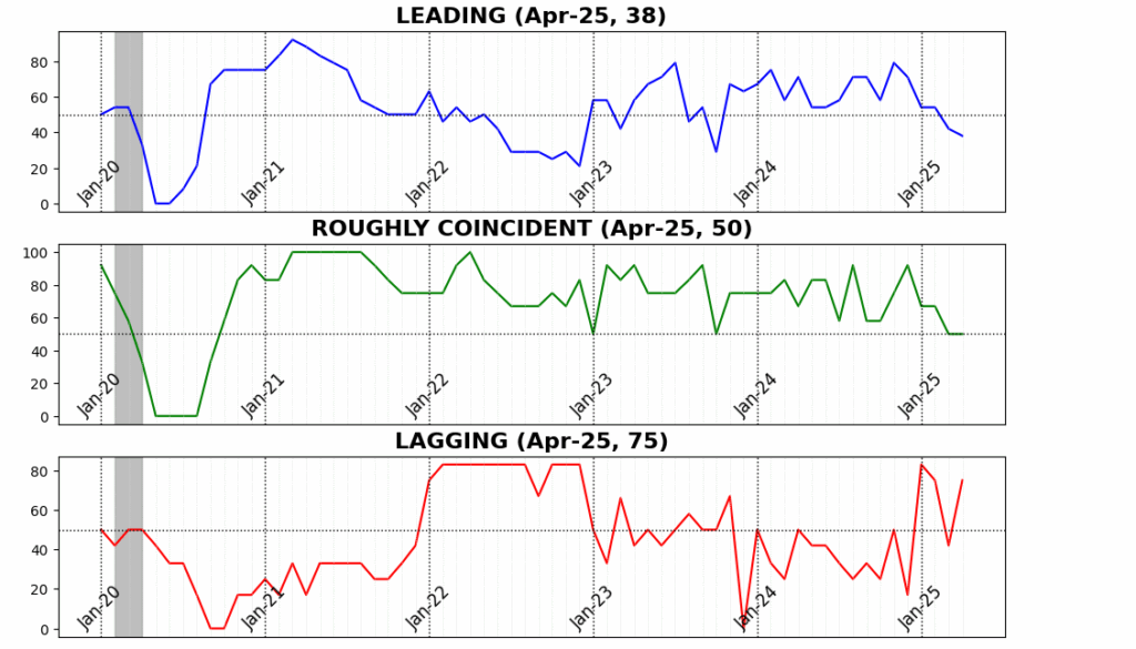 The Roughly Coincident Indicator held steady at 50, matching its March level. While this neutral reading may appear stable on the surface, it masks the underlying loss of pace that followed a string of stronger readings earlier in the year. The Lagging Indicator, by contrast, rebounded strongly — jumping 33 points to 75 — erasing its March plunge and signaling that backward-looking measures such as credit delinquencies and business debt service remain relatively firm, at least for now. But such lags are typical in economic slowdowns and don’t alter the broader picture of softening conditions across forward and present-focused metrics.