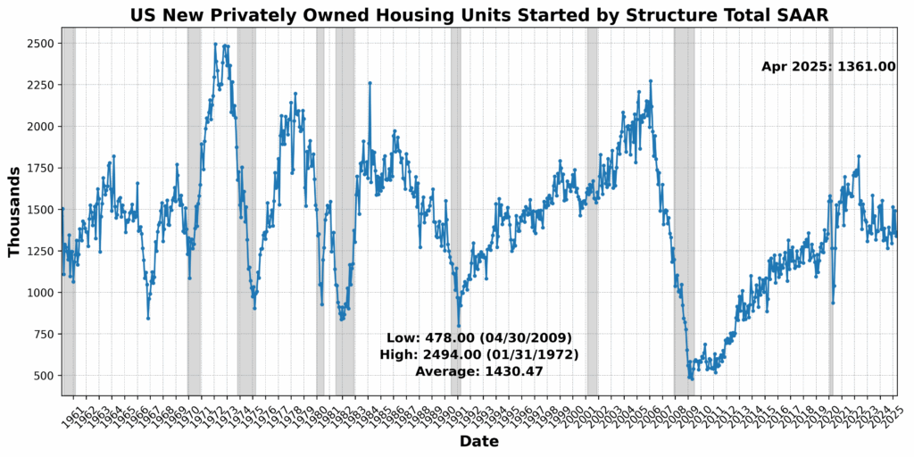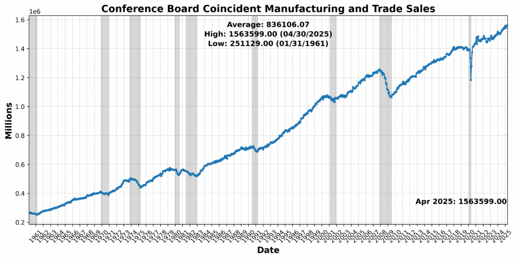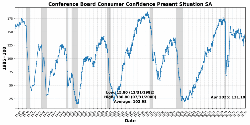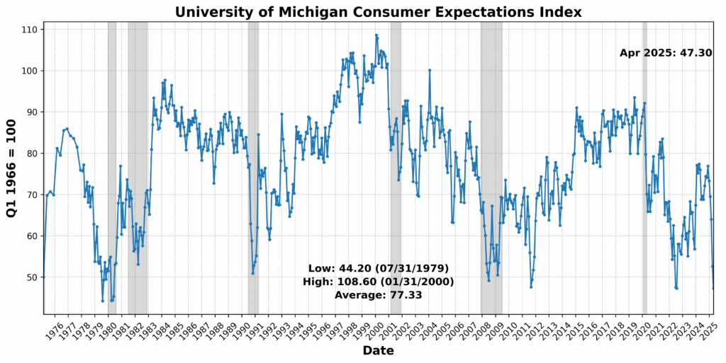 However, the sharp drop in the Lagging Indicator in December suggested that longer-term conditions, such as credit and cost structures, were already under pressure. After Trump’s inauguration in January 2025, the Leading Indicator declined again and has since continued its downward path, reaching just 38 in April — the lowest reading since late 2023. This steady erosion likely reflects mounting concern over the implications of the administration’s aggressive tariff posture, which by early April was being formally articulated but not yet broadly implemented. While the Lagging Indicator has rebounded (reflecting higher credit usage and other late-cycle dynamics), the broader pattern — of shrinking forward momentum, steady but unremarkable coincident activity, and an increasingly heavy reliance on back-end economic support — suggests that businesses and investors are growing wary of near-term risks. The honeymoon of post-election enthusiasm appears to have ended, and the economy is now bracing for the real-world impact of rising trade barriers and policy volatility.