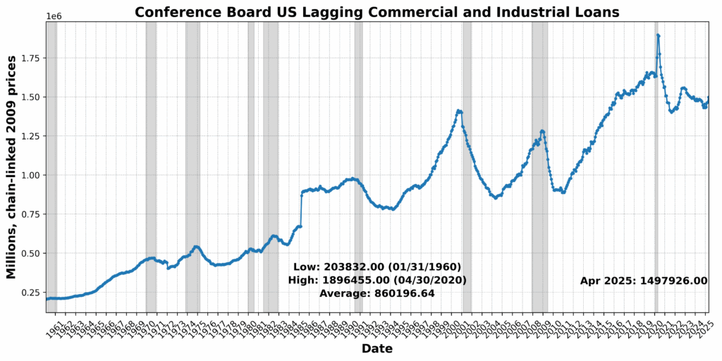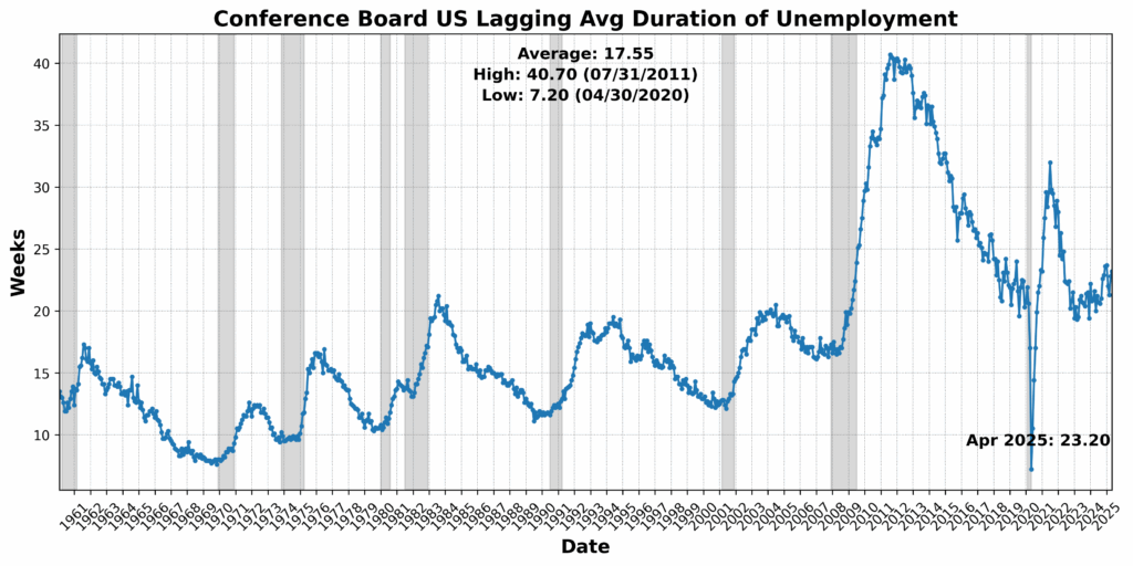 Altogether, the Lagging Index’s strong rebound reflects late-cycle dynamics: higher credit use, longer unemployment spells, and a firming of borrowing costs — consistent with a maturing, if not yet reversing, business cycle.