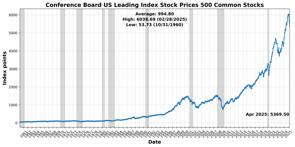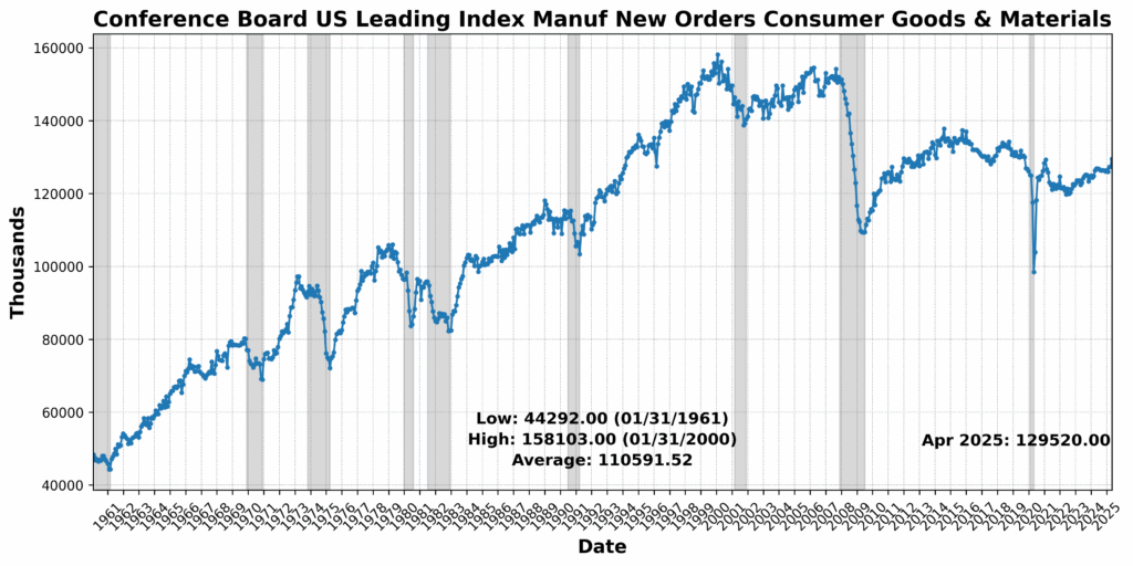 On the downside, the University of Michigan Consumer Expectations Index dropped sharply by 10.1 percent, signaling a weakening consumer outlook. US Initial Jobless Claims SA fell 10.0 percent — usually a positive sign — but in this context may reflect tightening labor conditions that are slowing momentum. Equity prices (via the Conference Board US Leading Index Stock Prices 500 Common Stocks) declined by 5.5 percent, while Debit Balances in Customers’ Securities Margin Accounts fell 3.4 percent, pointing to reduced investor risk appetite. Conference Board US Manufacturers’ New Orders Nondefense Capital Goods Ex Aircraft fell 1.1 percent, and US Average Weekly Hours All Employees Manufacturing SA slipped 0.5 percent — both early indicators of slowing industrial demand. The Treasury yield curve remained deeply inverted, with the 1-Year to 10-Year US Treasury Yield Spread at -73.4 percent, reinforcing recessionary signals. One component, the Inventory to Sales Ratio Total Business, was flat.