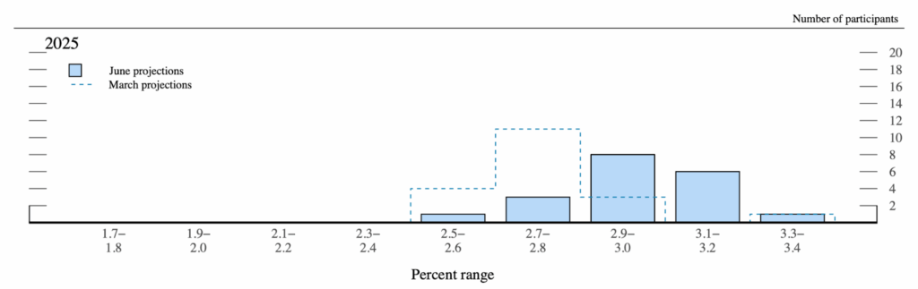 Figure 2. Distribution of participants’ projections for PCEPI inflation in 2025, as submitted in March and June