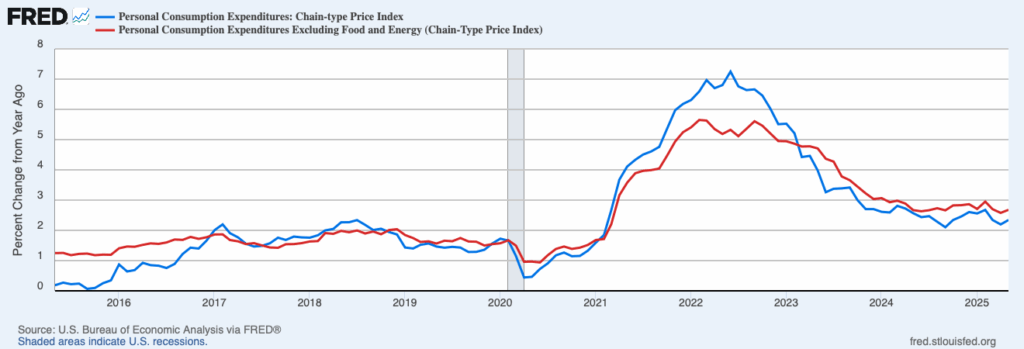 Figure 1. Headline and core PCEPI inflation, May 2015 to May 2025