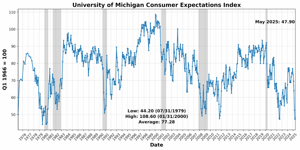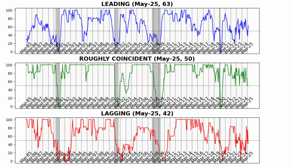 May, however, has brought a sharp counterpoint. The Leading Indicator jumping to 63 marks the strongest monthly gain since mid-2023, a rebound coinciding with the temporary suspension of the tariff platform on May 3. This offered a reprieve for investor sentiment and forward-looking components such as stock prices, jobless claims, and new orders. Yet that burst of optimism remains uneven: the Roughly Coincident Indicator held flat at 50 for the third straight month, suggesting current activity remains stagnant, while the Lagging Index slumped again to 42 — its third sharp swing in as many months.