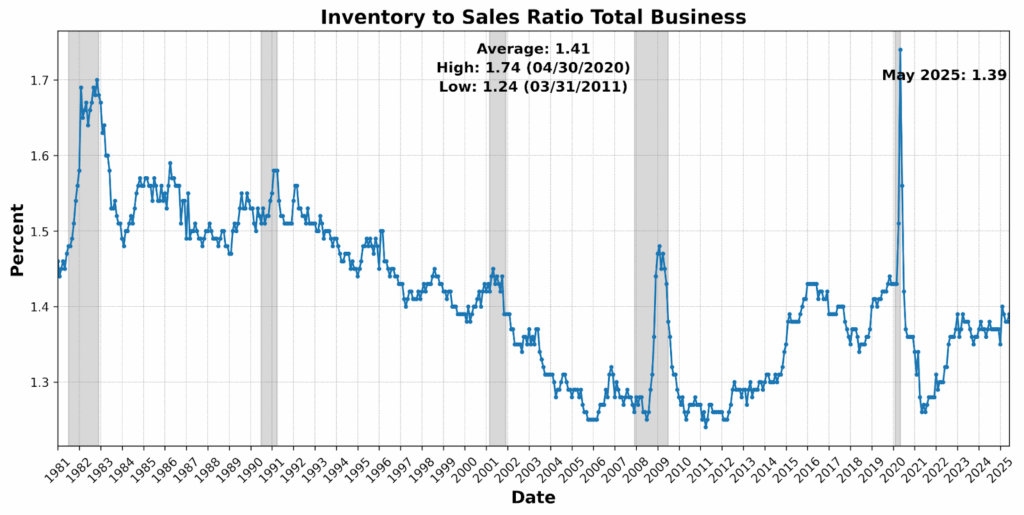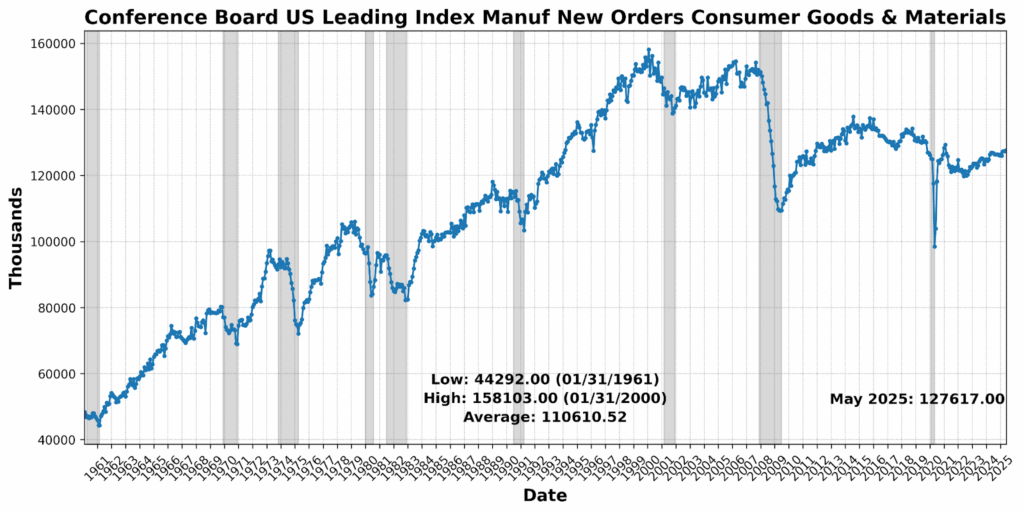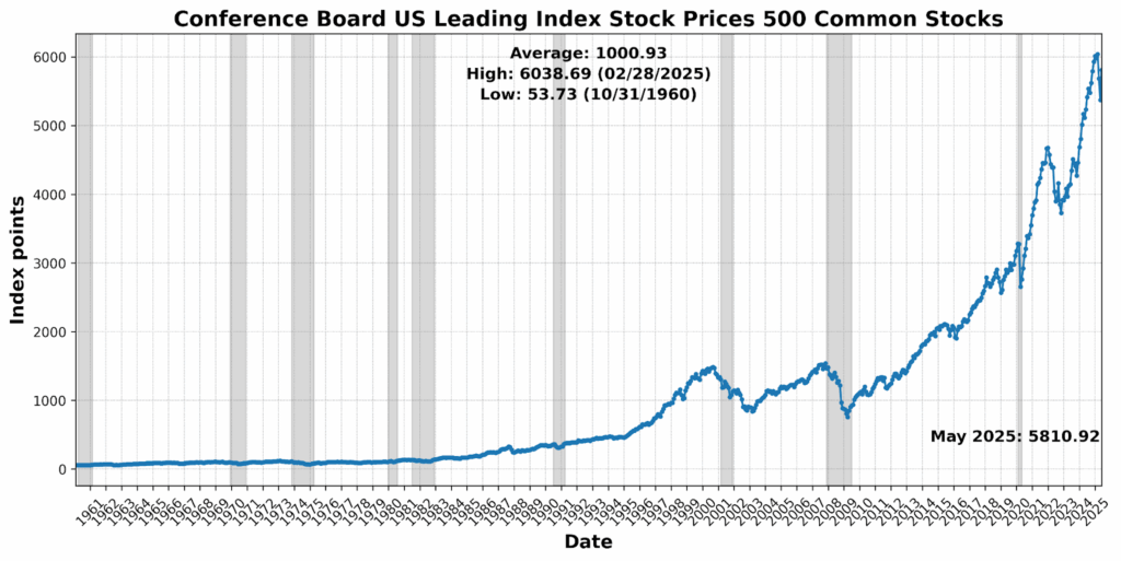Stock prices led the way, with the Conference Board’s 500 Common Stocks Index climbing 8.2 percent, while debit balances in margin accounts surged 8.3 percent — both reflecting renewed investor risk appetite in the wake of the “Liberation Day” market crash. Initial jobless claims fell 2.9 percent, and the University of Michigan’s Consumer Expectations Index rose 1.3 percent, pointing to improved labor conditions and household sentiment. Manufacturers’ new orders for nondefense capital goods excluding aircraft grew by 1.4 percent, and new orders for consumer goods ticked up 0.2 percent. Average weekly hours in manufacturing were unchanged, signaling a pause in deterioration. Among the declining components of the index, new housing starts dropped 9.8 percent, retail sales declined 0.9 percent, and heavy truck sales fell 1.5 percent — indicating pockets of weakness in consumer and industrial demand. The inventory-to-sales ratio rose slightly by 0.7 percent, and the yield curve remained inverted, with the 1-year to 10-year Treasury spread narrowing further by 5.1 percent. Despite these headwinds, the improvement across most leading indicators suggests a potential turning point in forward economic momentum.