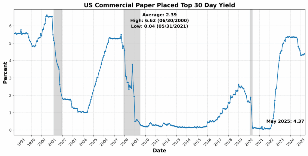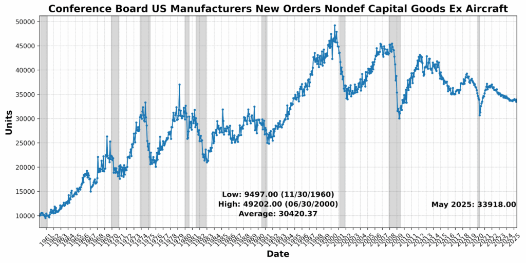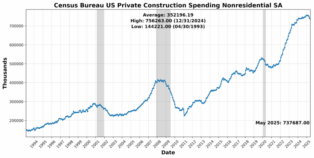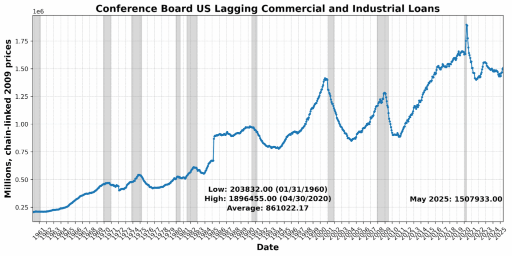 The most significant shift came from the average duration of unemployment, which dropped 6.0 percent — typically a positive sign, though sharp changes in this metric can also reflect volatility in labor force dynamics. Commercial paper yields declined 0.5 percent, and nonresidential private construction spending slipped 0.4 percent, indicating some tightening in credit conditions and a modest pullback in capital outlays. CPI excluding food and energy was flat year-over-year, offering no inflation surprise but also no added disinflationary momentum. Manufacturing and trade inventories remained unchanged, and commercial and industrial loans rose a modest 0.6 percent. On balance, the lagging data point to emerging soft spots in credit and investment, consistent with a maturing economic slowdown.