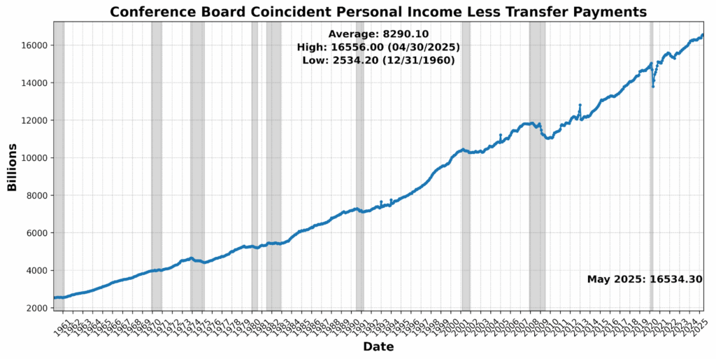 Following President Trump’s inauguration in January, the Leading Indicator began a steady slide, falling from 54 in both January and February to a low of 38 in April. That deterioration reflected rising anxiety around the administration’s aggressive trade and industrial policies, particularly the proposed implementation of immense tariffs beginning in early April. Coincident indicators flattened out at a neutral 50 in March and April, while the Lagging Index — more sensitive to trailing effects like credit usage and commercial construction — unexpectedly rebounded, suggesting the delayed momentum of late-cycle activity.