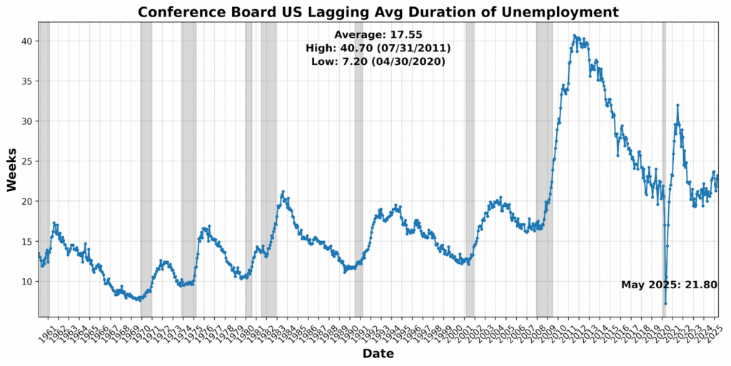 The Roughly Coincident Indicator remained unchanged at 50 for the second consecutive month. This flat reading reflects a lack of clear direction in real-time economic measures, with neither widespread contraction nor convincing strength evident across the data. Meanwhile, the Lagging Indicator fell 33 points to 42, giving back all of April’s gains and reinforcing the notion that trailing metrics are beginning to match to the broader slowdown. As usual, such delayed movement in backward-looking data is consistent with late-cycle dynamics and underscores the need for caution despite the recent uptick in leading trends.