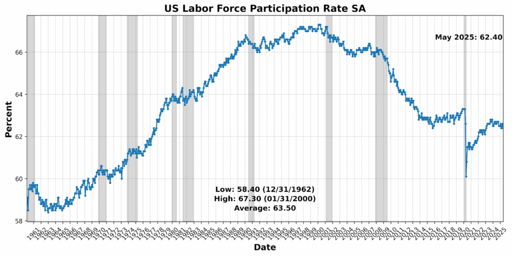 Conference Board Consumer Confidence Present Situation rose a strong 3.4 percent, suggesting households are feeling somewhat more secure about current conditions. Manufacturing and trade sales edged up 0.2 percent, and nonfarm payrolls posted a modest 0.1 percent gain — both hinting at continued, if modest, economic activity. Offsetting these improvements, personal income less transfer payments slipped 0.1 percent, while industrial production contracted by 0.2 percent. The labor force participation rate also moved lower, falling 0.3 percent, a sign that labor supply may be weakening slightly. Overall, the data continue to reflect a stalled expansion: one with enough strength to prevent decline but insufficient momentum to signal a sustained upswing.