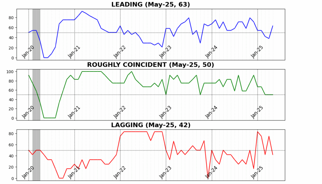 The Leading Indicator jumped sharply to 63 in May, driven by broad-based improvements across forward-looking indicators. Nine of the twelve components registered gains, marking a decisive shift from the contractionary readings seen in recent months.