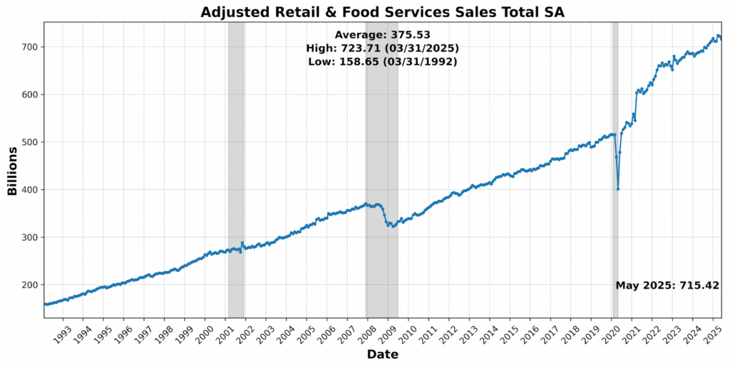 June’s retail sales rose a better-than-expected 0.6 percent, marking a broad-based rebound from May’s sharp 0.9 percent decline and reflecting strength in categories like motor vehicles, building materials, and general merchandise. However, the gain is difficult to interpret cleanly, as rising prices — particularly in tariff-impacted goods — likely inflated nominal sales, blurring the line between real demand and price pass-through. Electronics and furniture sales, which are among the categories most exposed to tariffs, fell modestly, reinforcing that price-sensitive discretionary demand is faltering even as nominal totals rise. The control group, used to estimate real consumption in GDP, rose 0.5 percent, though downward revisions to prior months suggest that second-quarter real consumer spending may undershoot current forecasts. Meanwhile, sales at bars and restaurants rebounded but remained below their three-month average, aligning with consumer sentiment surveys showing improved balance-sheet optimism but weaker income-related confidence, particularly among Democrats reacting to tariff news. The divergence between modestly stronger spending and weakening small-business sentiment — combined with evidence of slowing job growth and shorter workweeks — suggests the consumer is still spending but increasingly selective, and likely vulnerable to further price shocks. This dynamic is consistent with June’s CPI report, which showed mild core inflation overall but rising prices in tariff-sensitive categories, suggesting the apparent consumption resilience may prove short-lived.