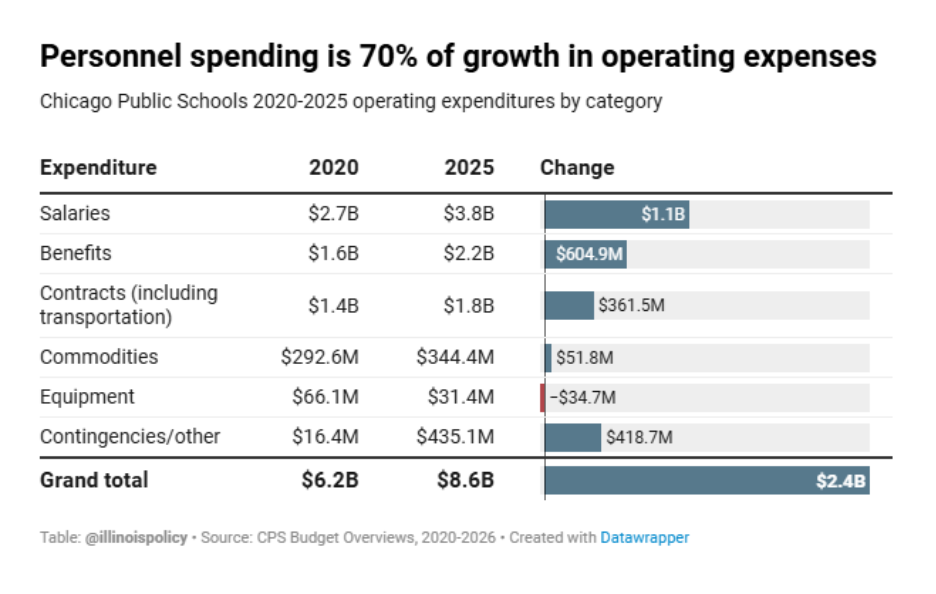 Every dollar spent on debt service is a dollar not spent on textbooks, technology, safety systems, facilities, or instruction. This squeeze comes at a time when funds for students are already strained. The chart below from the Illinois Policy Institute shows that spending on personnel accounts for 70 percent of the growth in operating expenses for CPS.