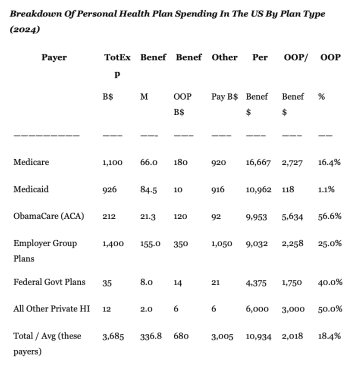 When it comes to the balance of the third-party payments pools, the out-of-pocket portion of total expense is considerably higher than under the two big government health care entitlements. In the case of ObamaCare, the 21.3 million beneficiaries paid $120 billion or 56% of the cost in 2024.
