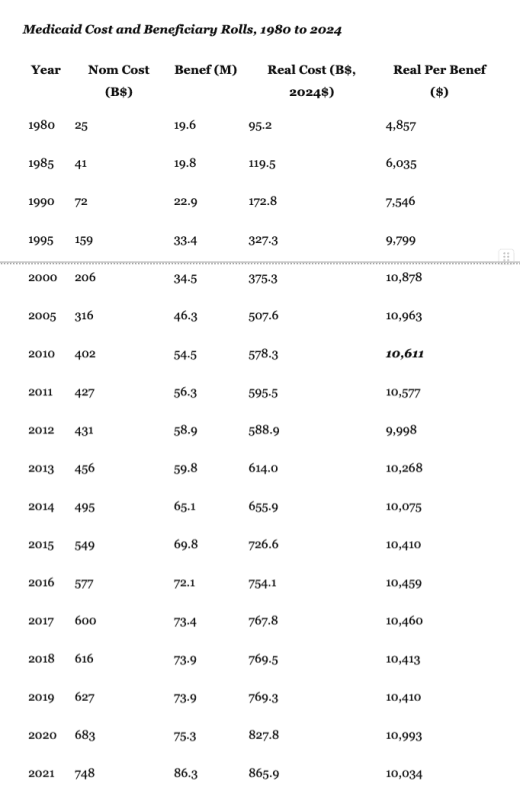 To wit, total enrollment has risen from just under 20 million in 1980 to a recent pandemic-period peak of nearly 100 million. At the same time, the constant dollar cost (2024 $) has surged from $4,857 per beneficiary in 1980 to $10,959 in 2024.